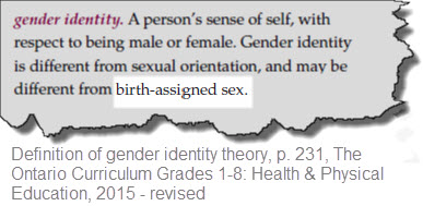 • Gender Identity theory is not science-based teaching, but rather a dangerous socio-political philosophy that seeks to normalize a mental disorder. Gender identity confusion is still recognized by the American Psychiatric Association's Diagnostic & Statistics Manual as a "gender dysphoria" disorder. This ideology being foisted on school children by the Wynne government aims to indoctrinate the next generation into believing that transgenderism/transsexualism is an innate, genetic characteristic just like skin colour or race.